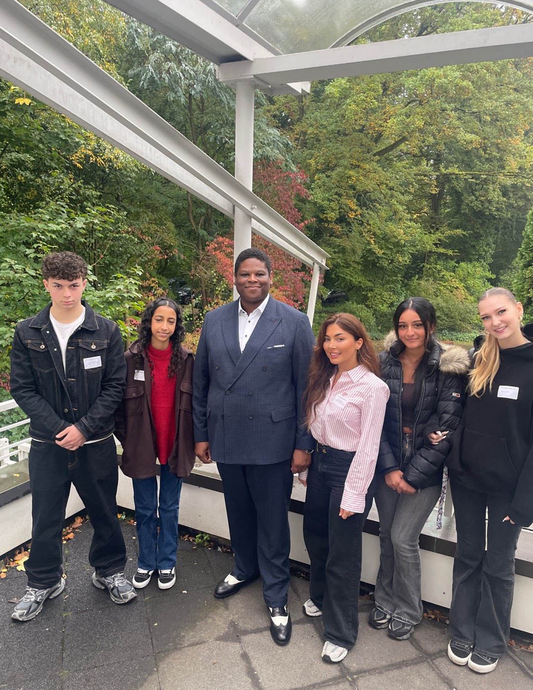 Von links nach rechts: Luis W., Naoual A., Prof. Dr. Lorenz Narku Laing, Frau Aygün‑Vural, Falaknaz H. und Amina I.