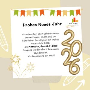 Wir wünschen allen ein frohes, gesundes Jahr 2026. Am Mittwoch, den 07.01.2026 sehen wir uns alle wieder in der Schule. Der Unterricht beginnt nach Stundenplan. Wir freuen uns auf euch!